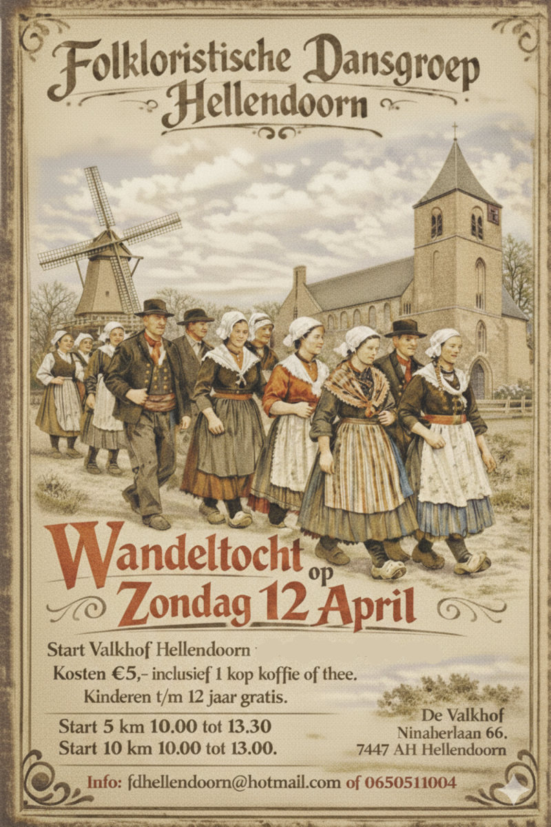 Folkloristische Dansgroep Hellendoorn organiseert op zondag 12 april 2026 hun jaarlijkse wandeltocht.